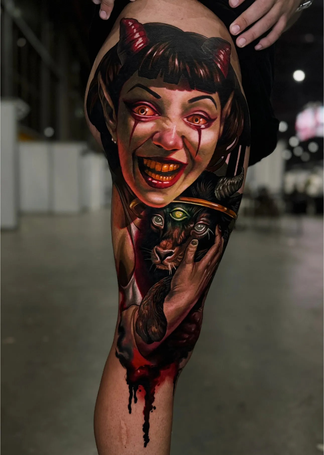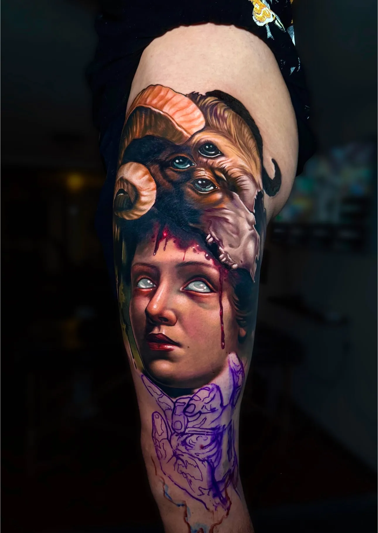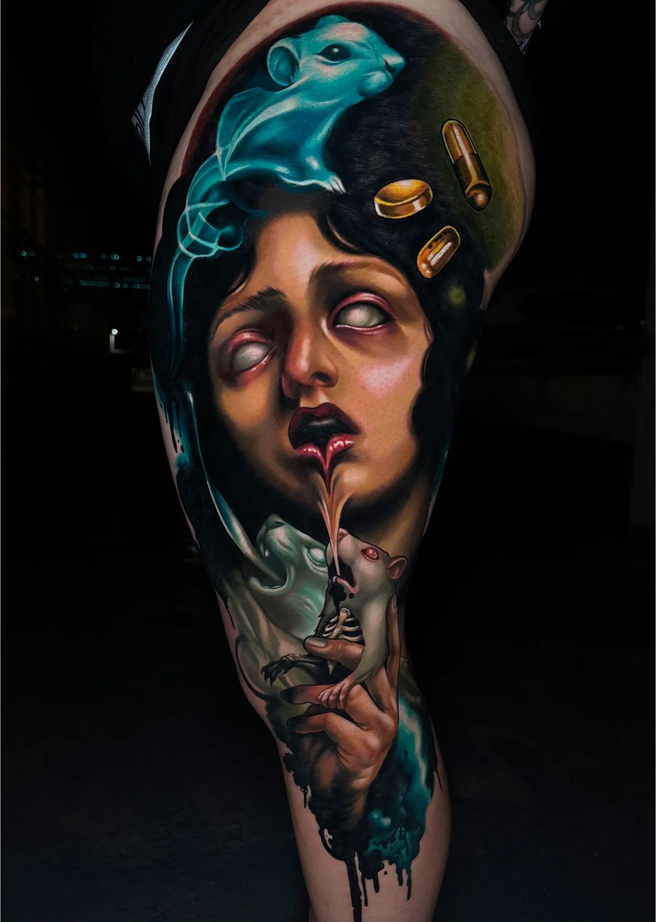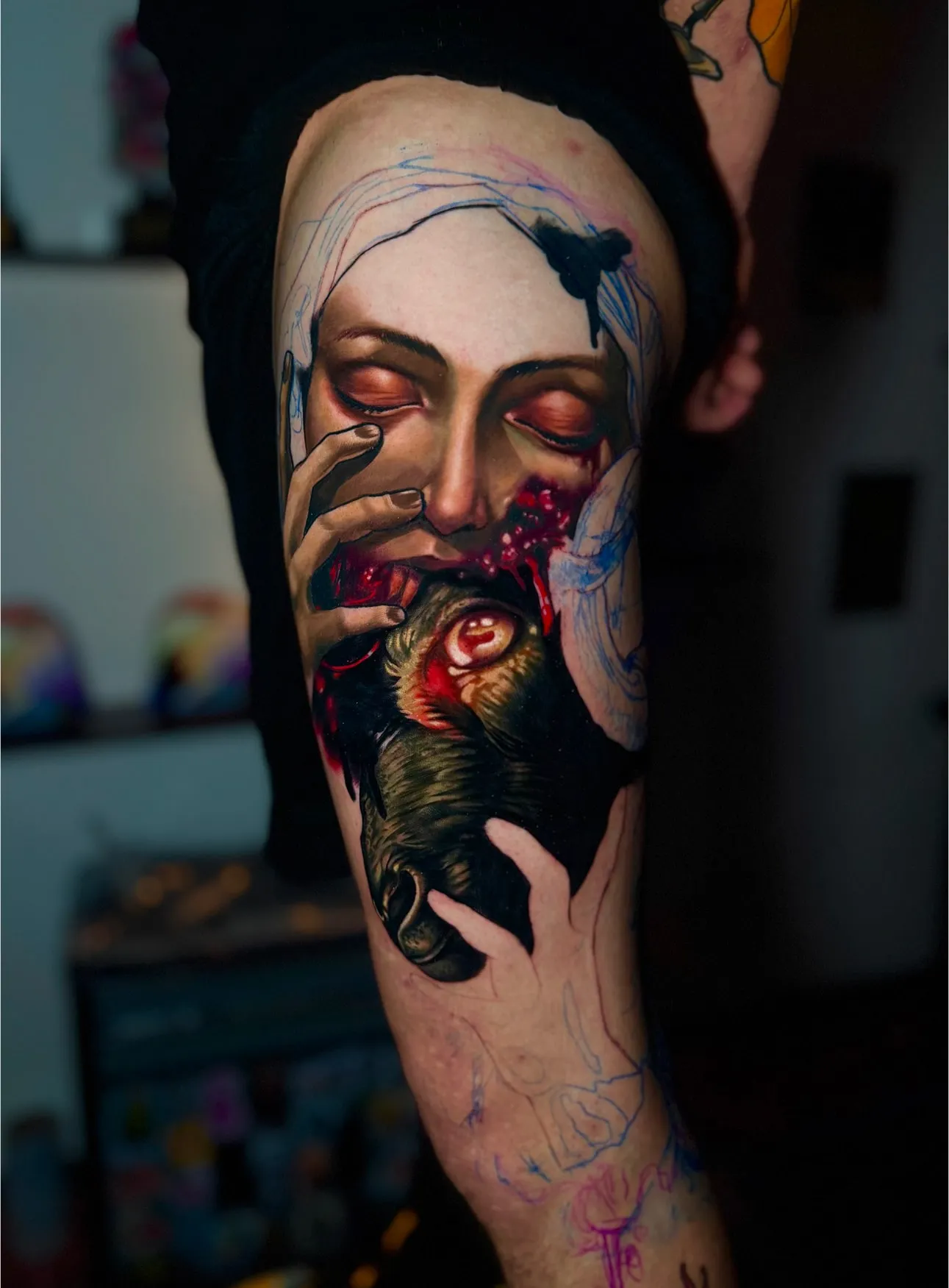 Today, my style has evolved into a unique fusion: horror-inspired compositions influenced by Renaissance art, executed with realistic techniques but infused with the expressive freedom of new school. This evolution reflects not only my artistic growth but also my creative vision.